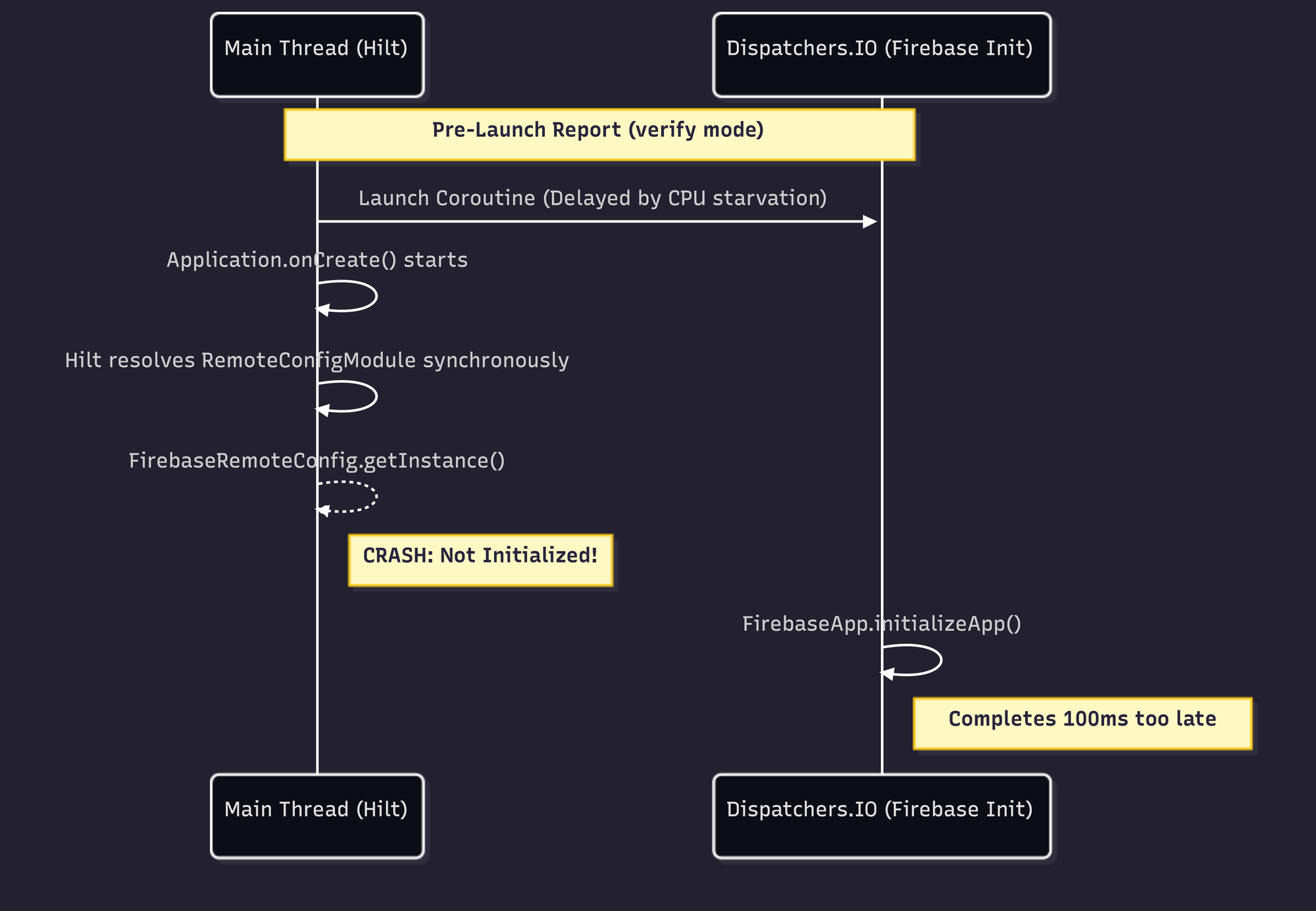 In Test Lab, three heavy processes fight for limited vCPU cycles: your app's main thread, dex2oat verifying DEX files, and the Robo crawler. Because Dispatchers.IO uses a shared thread pool, CPU starvation causes scheduling delays. That coroutine might take 150ms+ to launch. Hilt resolves synchronously on the main thread, beating Firebase to the punch. Result: IllegalStateException.