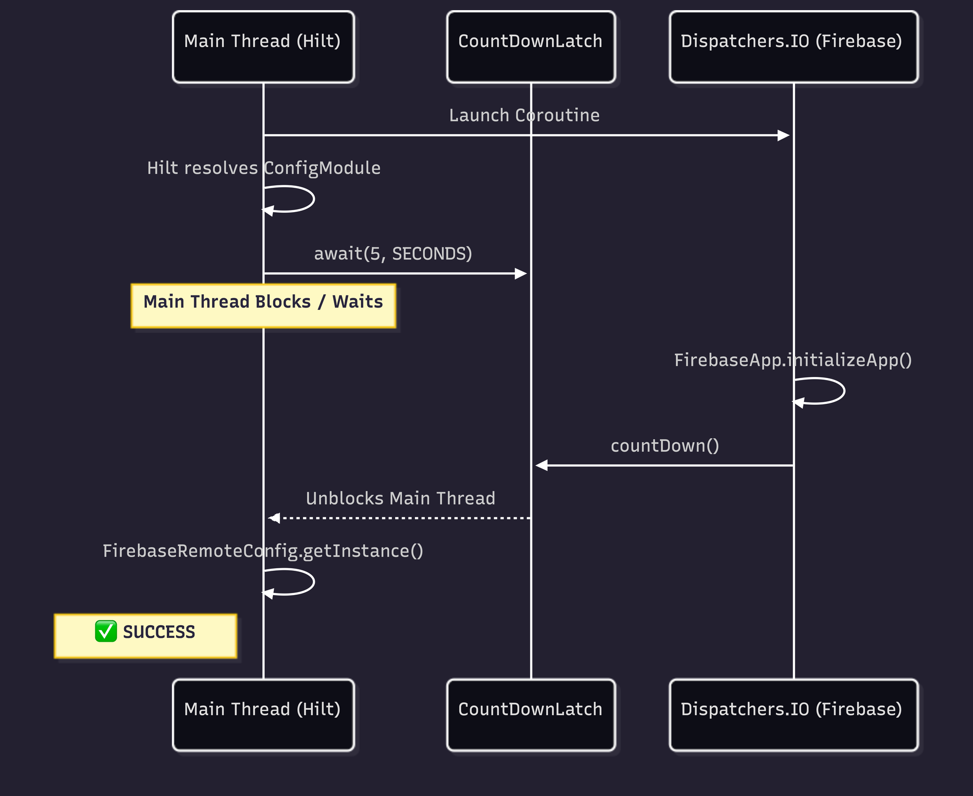 Crucially: Add a timeout. Never block the main thread indefinitely. If Firebase fails to initialize within 5 seconds, it is better to crash cleanly or provide a fallback than to trigger a guaranteed ANR. Firebase's own Utils.awaitEvenIfOnMainThread()caused 100% reproducible ANRs by doing exactly this β blocking without a reasonable timeout.