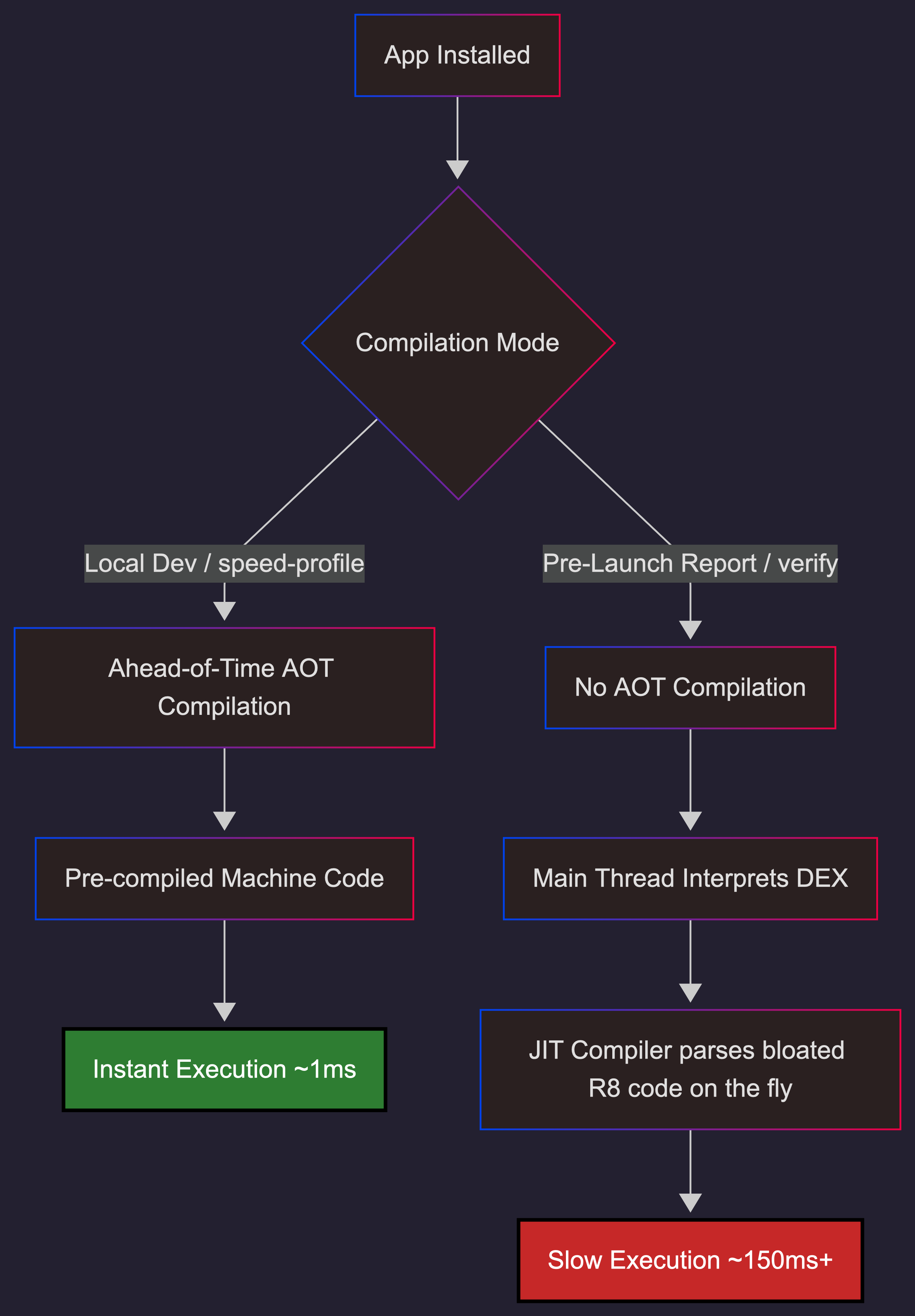 In AOT mode, this is pre-compiled machine code that executes in microseconds. But in verify mode, the JIT compiler must parse and compile this bloated method on the fly, directly on the main thread. This JIT overhead acts as a massive speed bump, wildly expanding the window for race conditions.